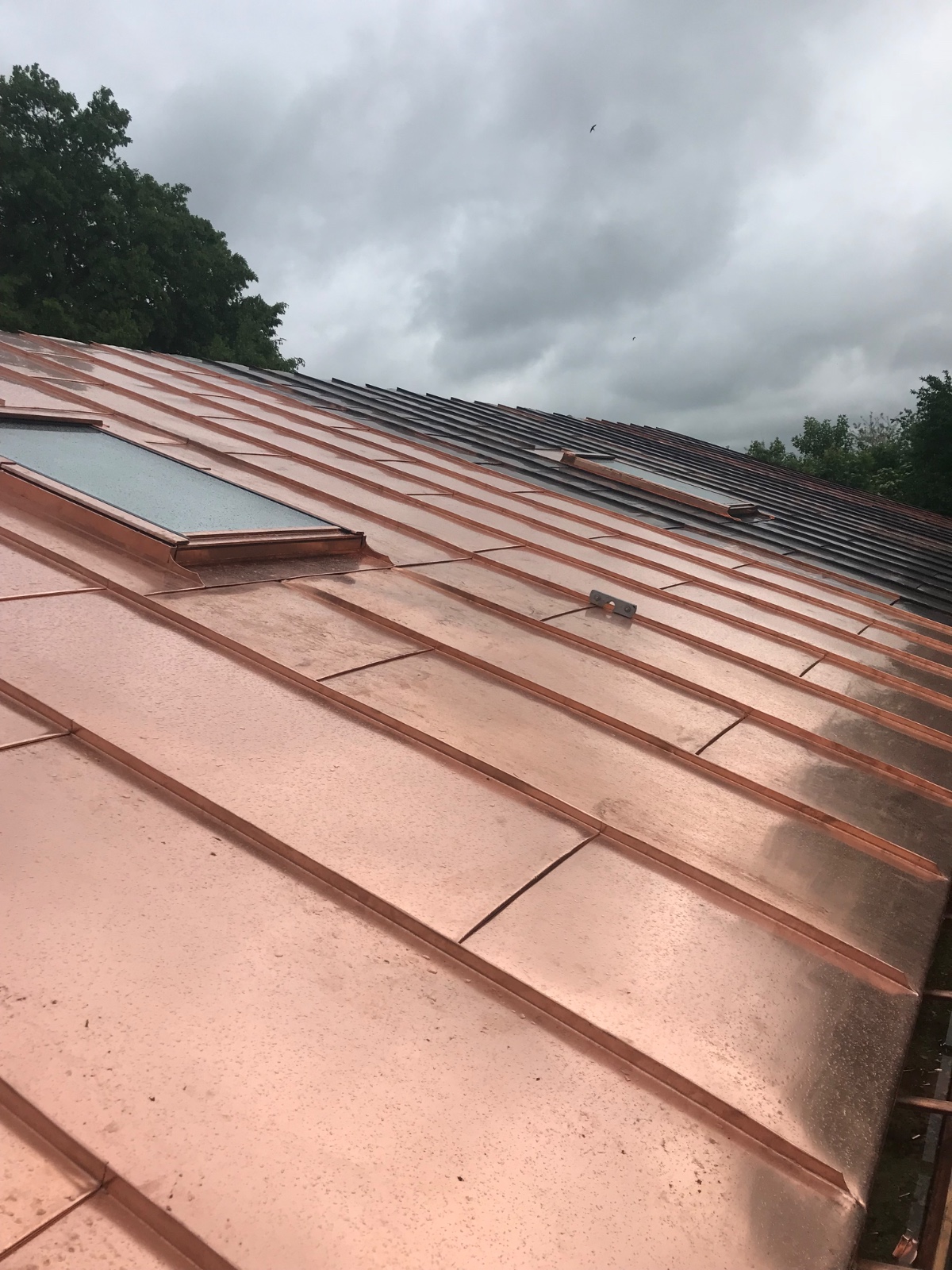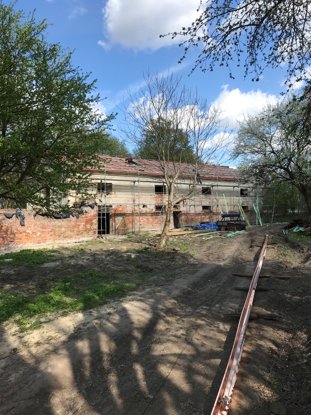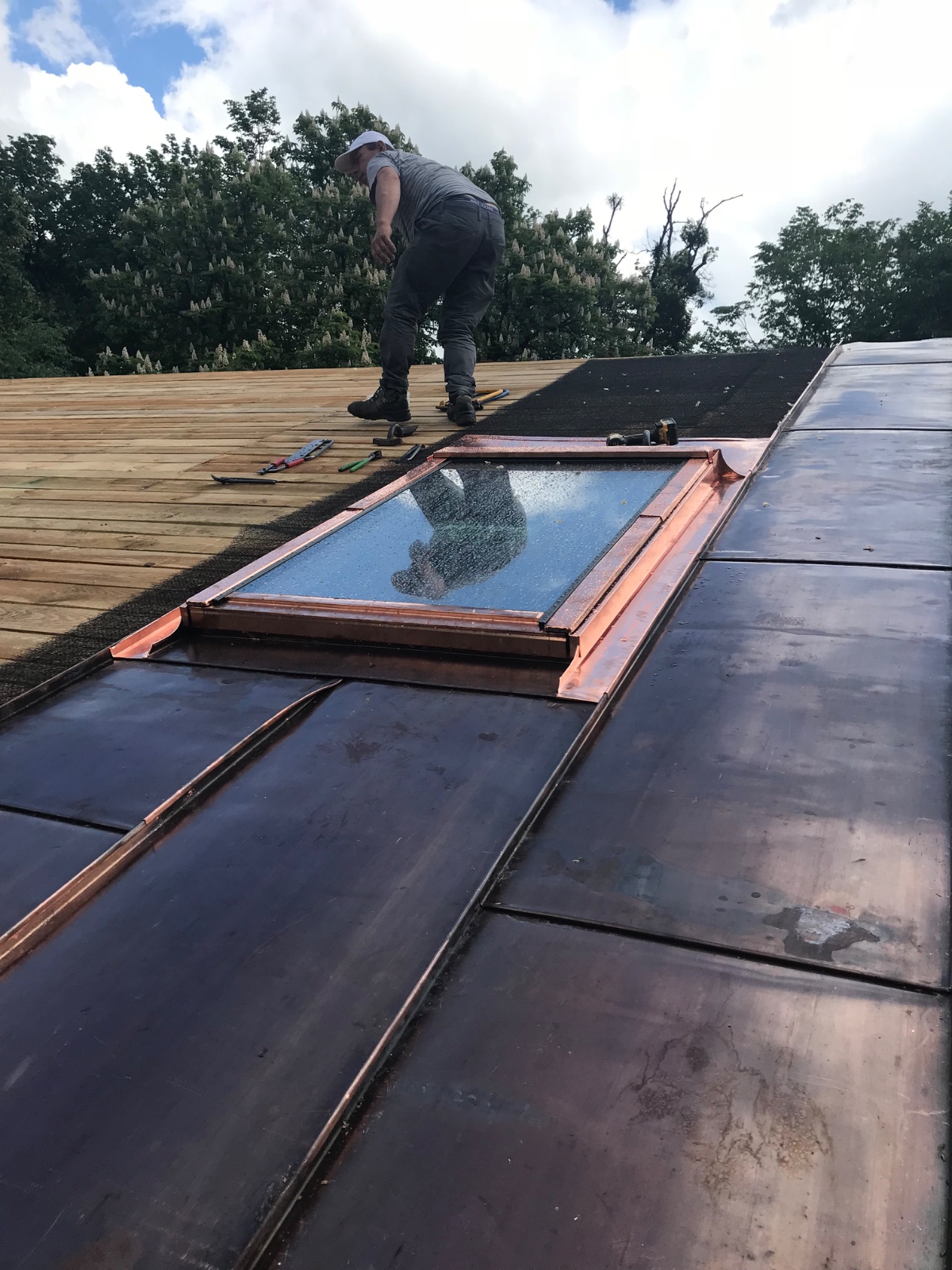 Postanowiliśmy wykonać niewielki, a jakże istotny krok zabezpieczający cały budynek. Wiązało się to z dużymi nakładami finansowymi. Zastosowaliśmy, tak jak w oryginale pokrycie blaszane. Z uwagi na walory estetyczne i swoją wyjątkowa trwałość (szacowaną na 100 do 300 lat) użyliśmy bardzo ceniony materiał jakim jest blacha miedziana. Z tego materiału został wykonany również system rynnowy.