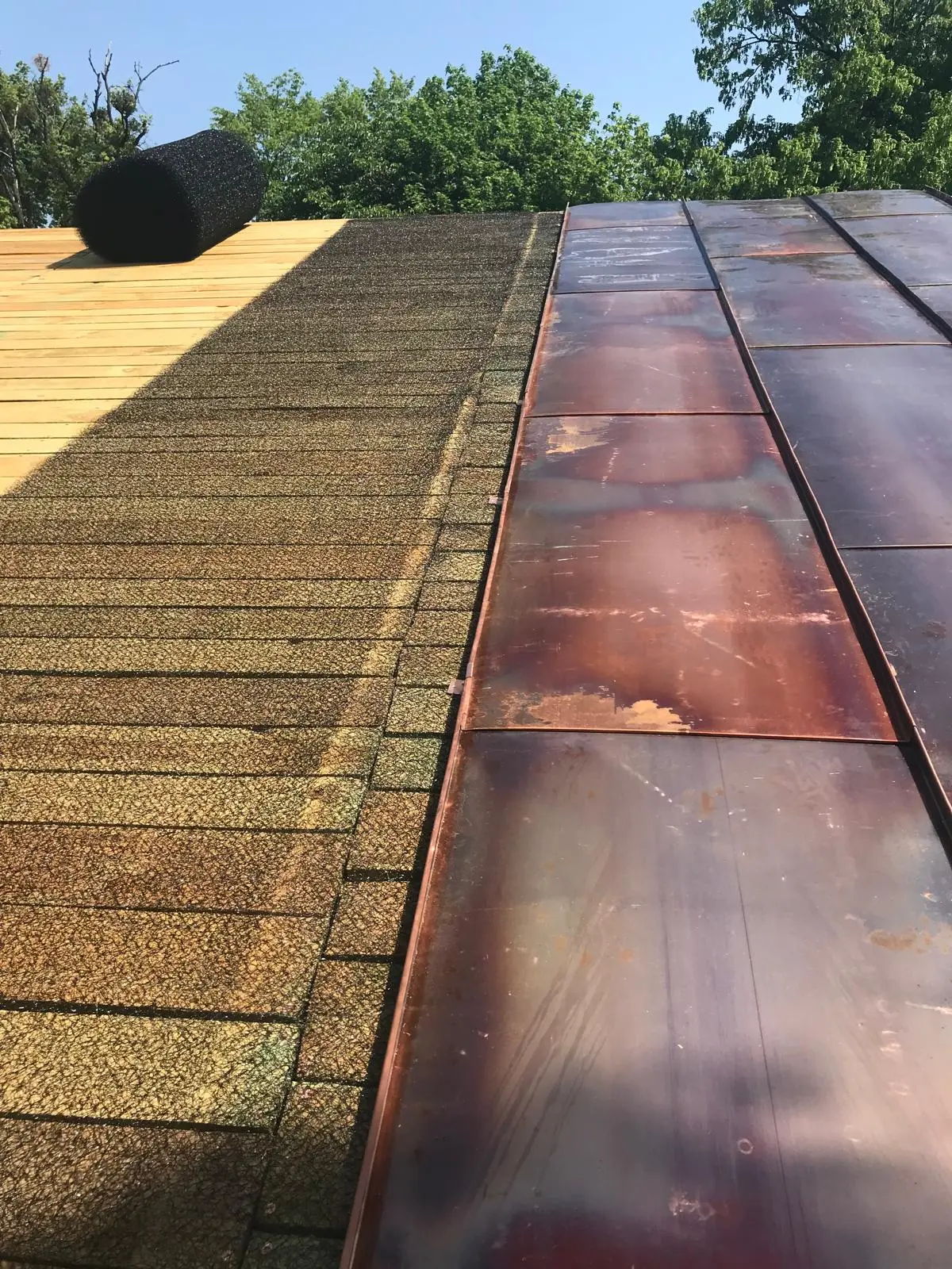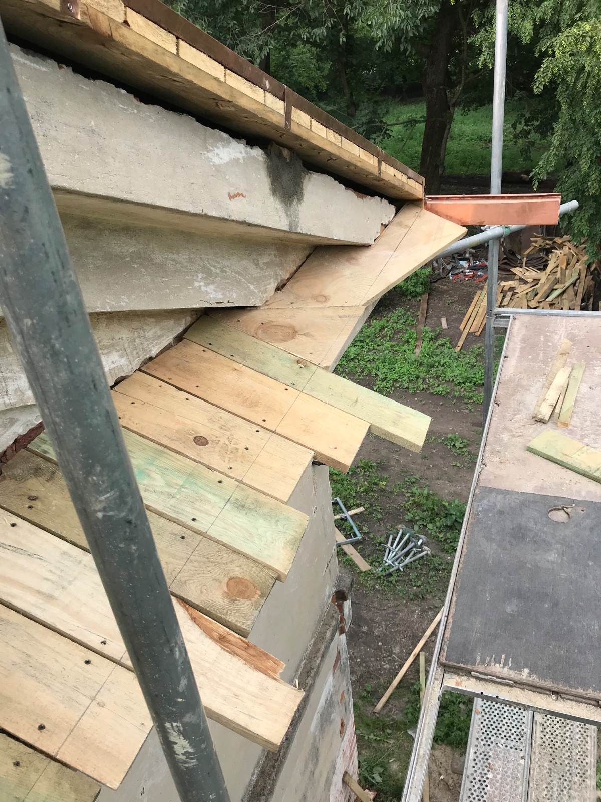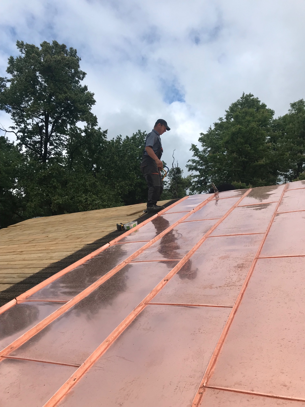 Postanowiliśmy wykonać niewielki, a jakże istotny krok zabezpieczający cały budynek. Wiązało się to z dużymi nakładami finansowymi. Zastosowaliśmy, tak jak w oryginale pokrycie blaszane. Z uwagi na walory estetyczne i swoją wyjątkowa trwałość (szacowaną na 100 do 300 lat) użyliśmy bardzo ceniony materiał jakim jest blacha miedziana. Z tego materiału został wykonany również system rynnowy.