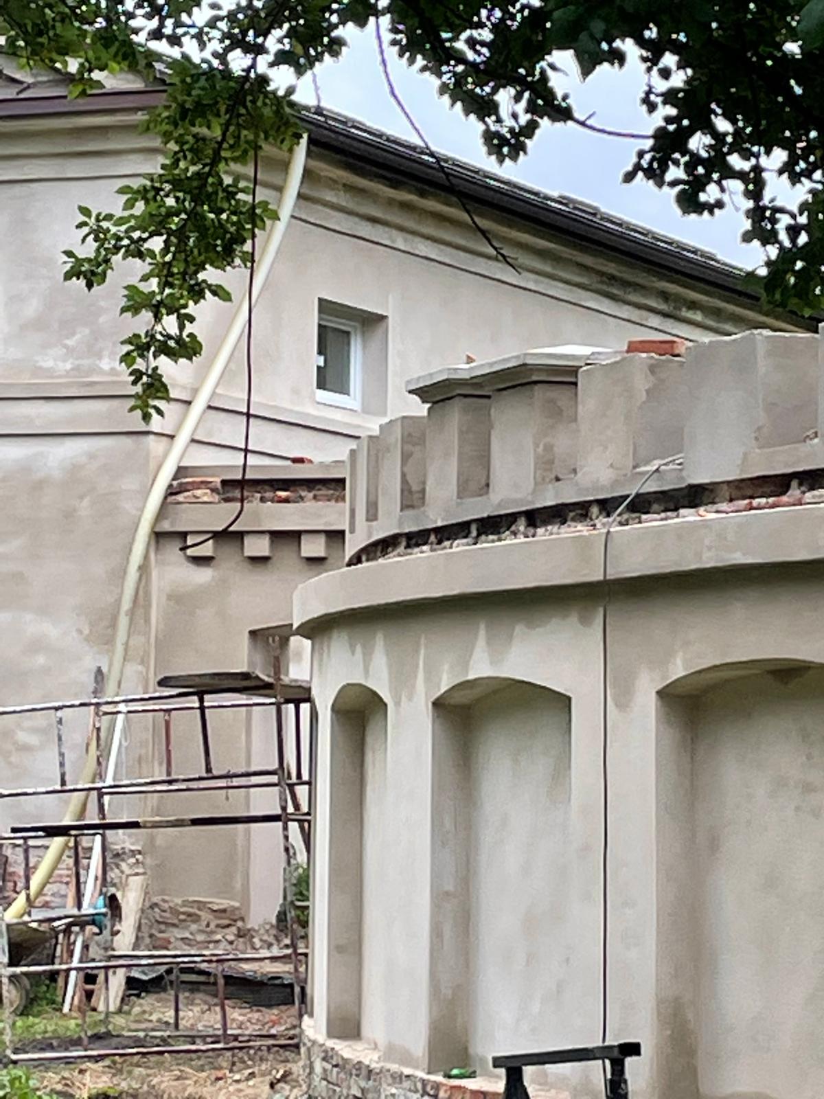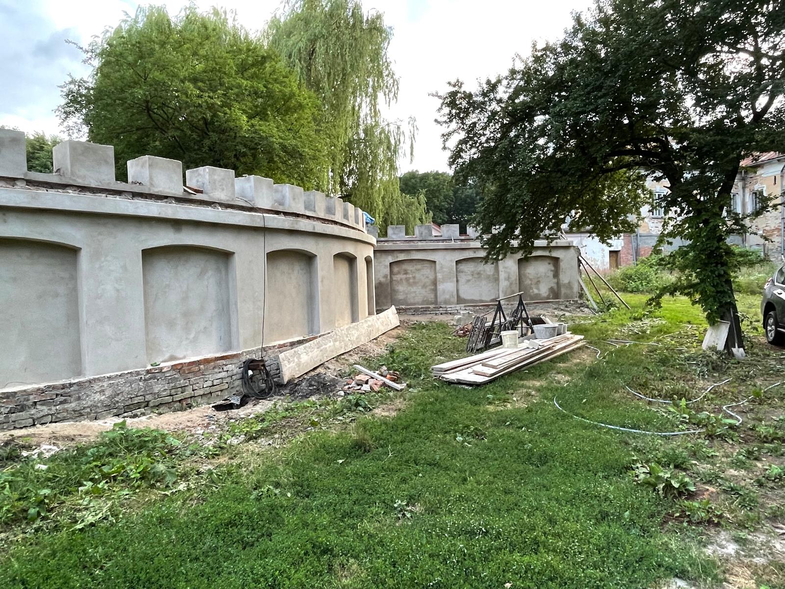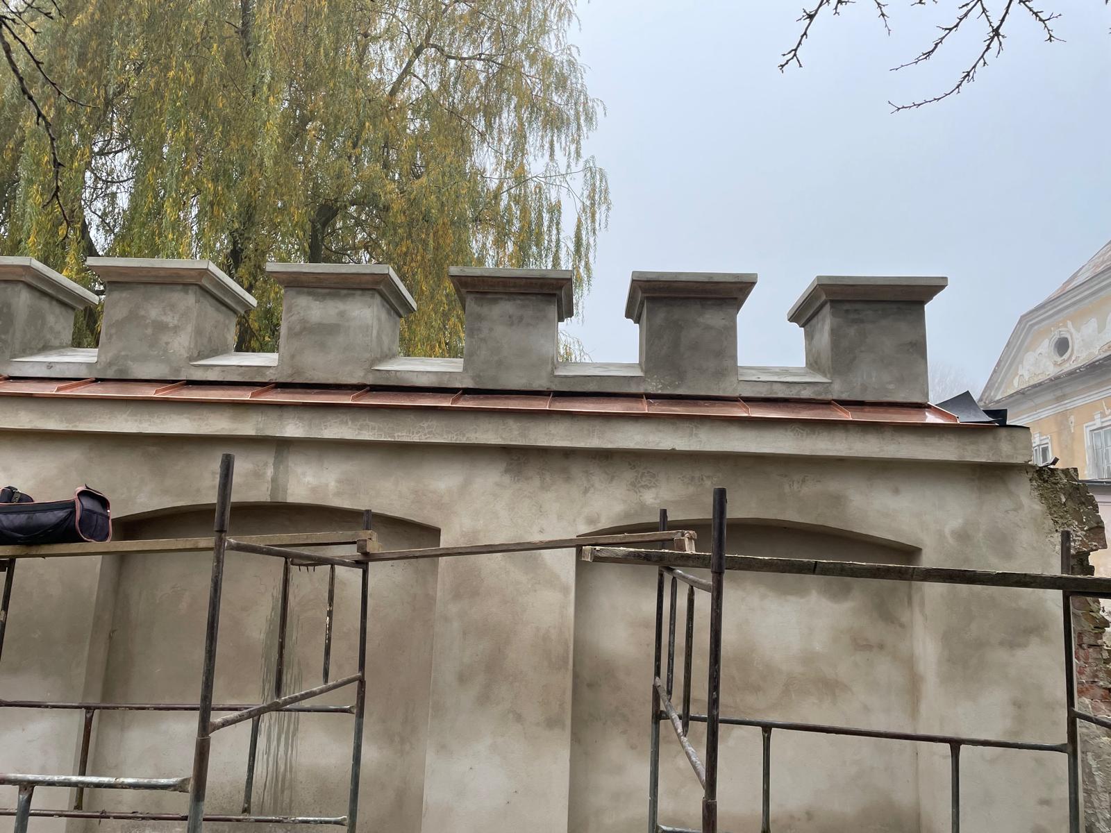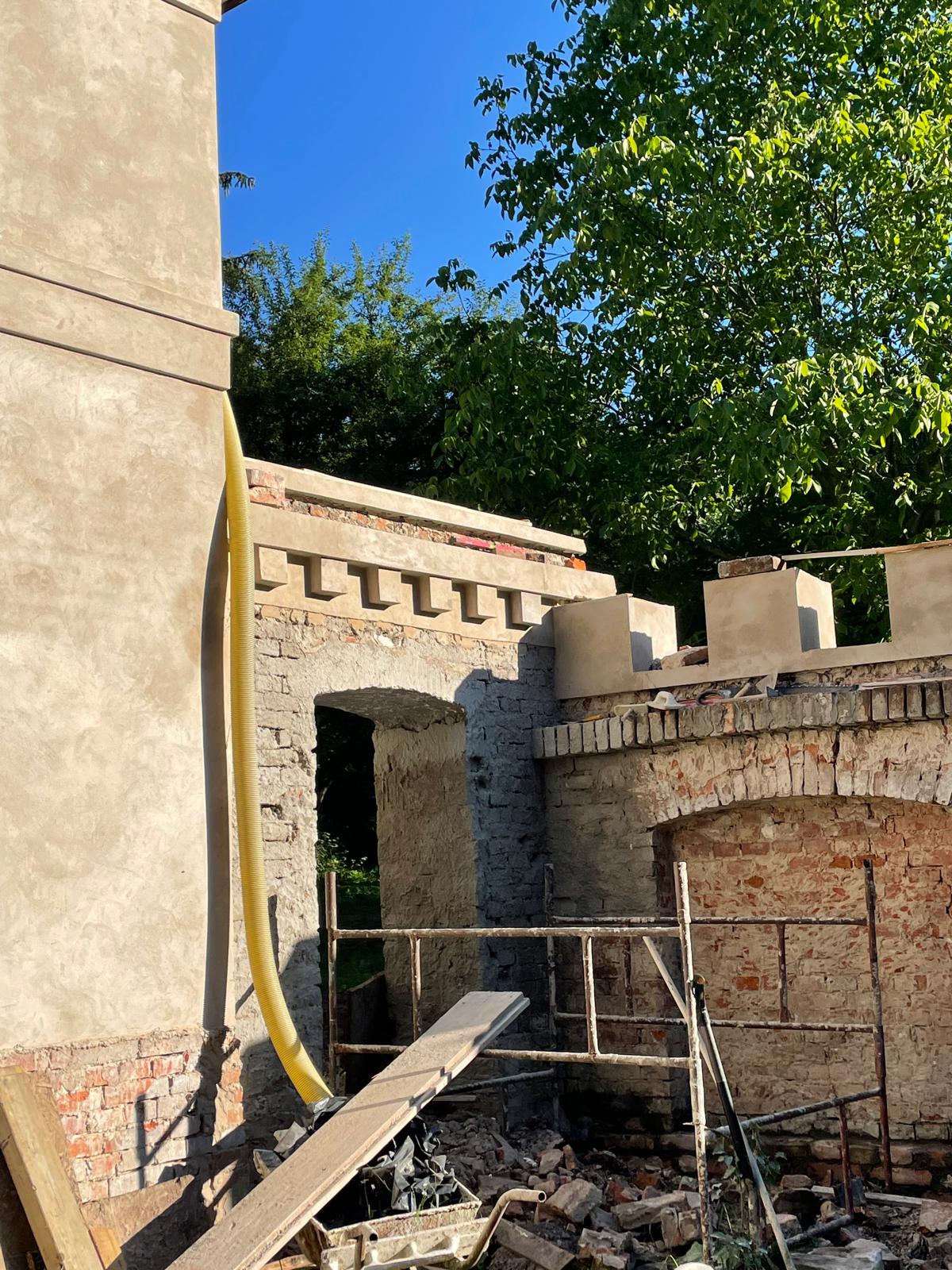 W architekturze naszego krajobrazu, mur stanowi istotną część architektury, który oddziela część prywatną od części gospodarczej. Zastosowaliśmy materiały najwyższej jakości, tj. zaprawę cementowo-wapienną do przywrócenia i odwzorowania tynków. Mur został zabezpieczony czapami betonowymi. Głównym ich zadaniem jest ochrona korony (góry) muru przed szkodliwym działaniem warunków atmosferycznych.