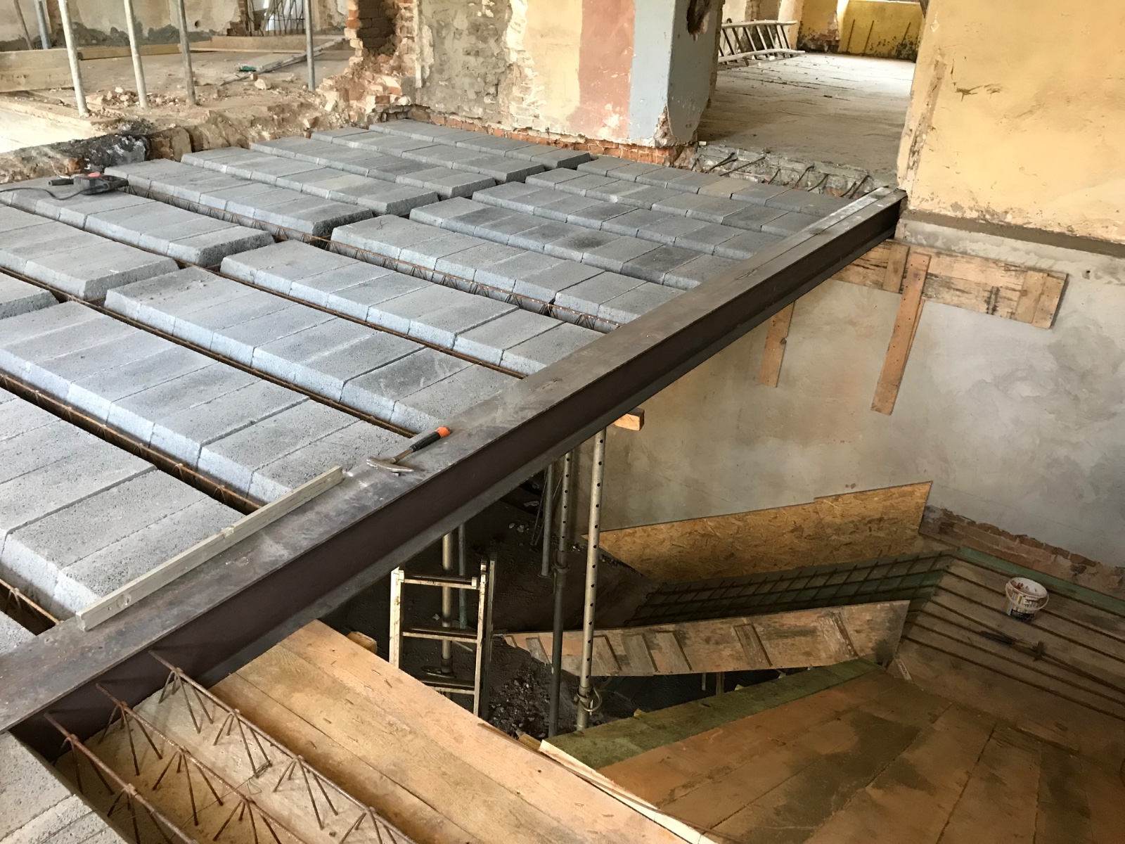 Prace wewnątrz pałacu prowadzone są z ogromnym szacunkiem dla jego historycznej substancji, łącząc nowoczesną trwałość z dbałością o detale. Kluczowym etapem była modernizacja konstrukcyjna, obejmująca wykonanie nowych stropów oraz solidnych betonowych schodów.